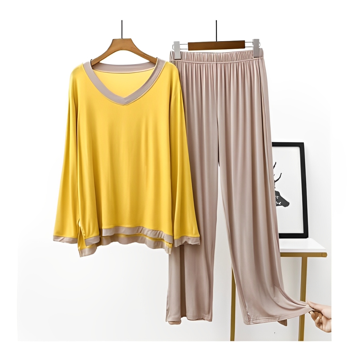 Yellow V Neck With Skin Contrast Palazzo For Women PJ Set